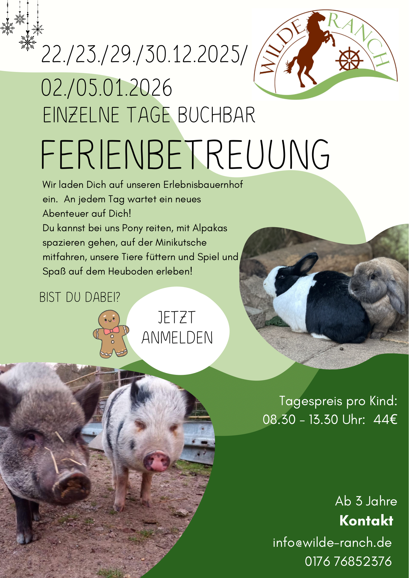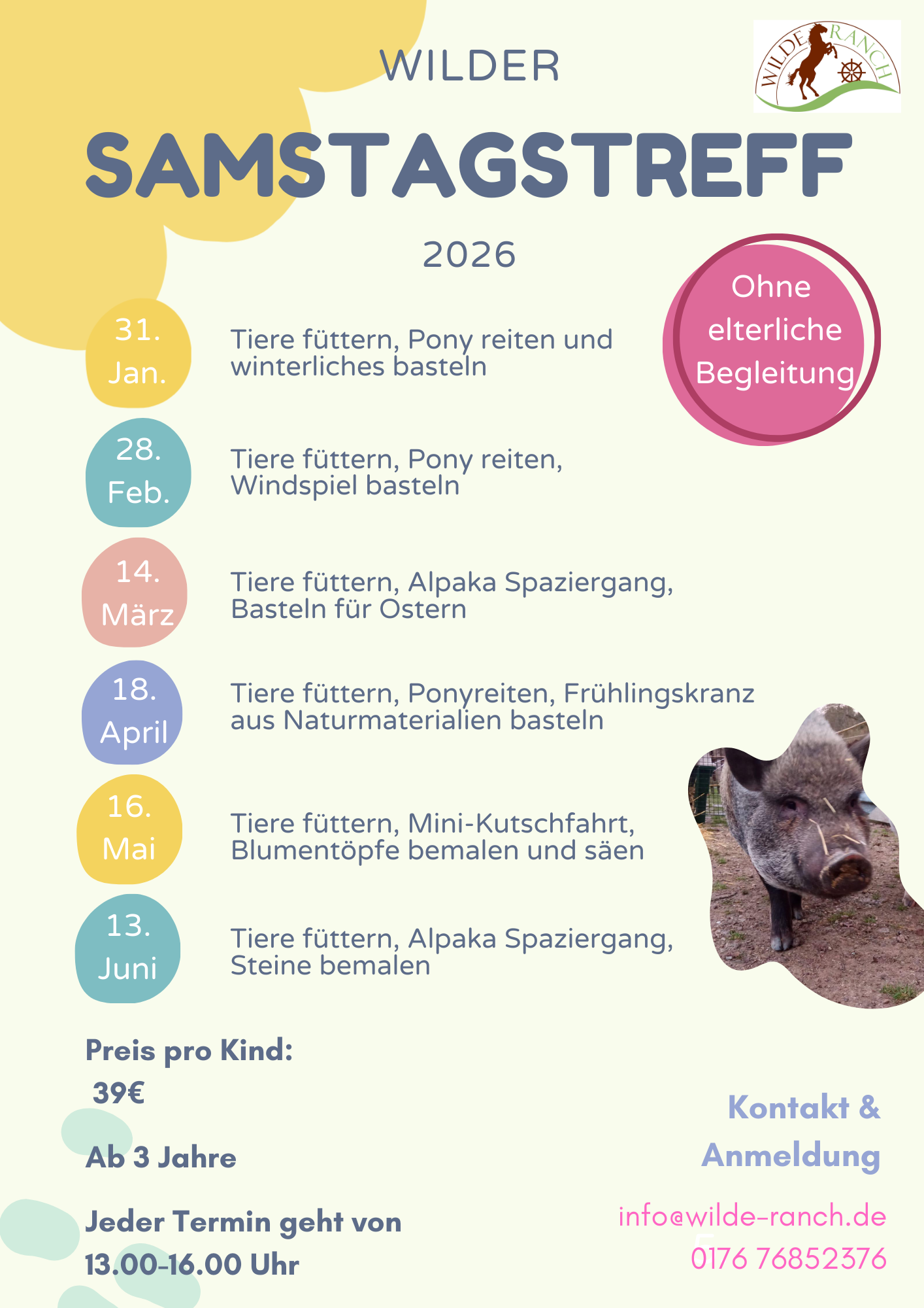 Bitte beachten Sie, dass ein Besuch der Wilde Ranch nur mit voriger Terminvereinbarung bzw Anmeldung zu einem unserer Angebote unter 0176-76852376 oder info@wilde-ranch.de möglich ist!